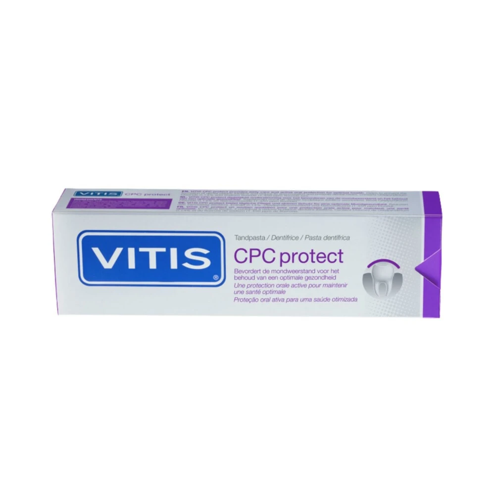 Vitis Tandpasta CPC ProtectDe Vitis CPC Protect tandpasta is speciaal ontwikkeld om de mondweerstand te verbeteren en de adem te verfrissen.Kenmerken van Vitis CPC ProtectAnti-plaque werking tegen cariës (gaatjes) en tandbederfVerbetert de mondweerstandBevat een hoge concentratie Cetylpyridinium Chloride (CPC)Versterkt het tandglazuur en voorkomt (tandhals)cariës