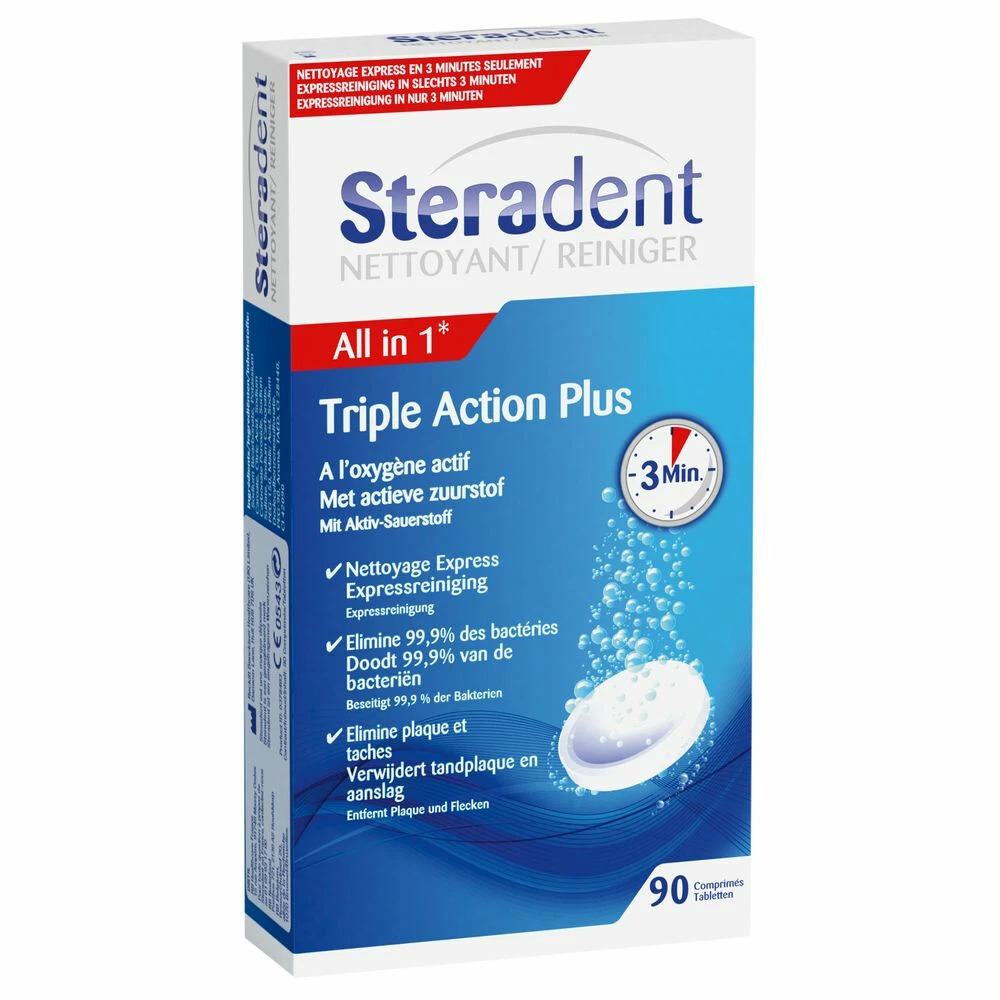 Steradent Triple Action Plus Kunstgebit Reiniger 90 tablettenSteradent Triple Action Plus reinigt uw kunstgebit grondig. Bij gebruik tweemaal per dag zorgt Steradent Triple Action Plus voor een perfect schone en gladde prothese. Triple Action Plus reinigt op 3 manieren:Doodt 99,9% van de bacteriënVerwijdert 50% meer tandplak en vlekkenDe actieve zuurstof bereikt alle delen van de gebitsprothese