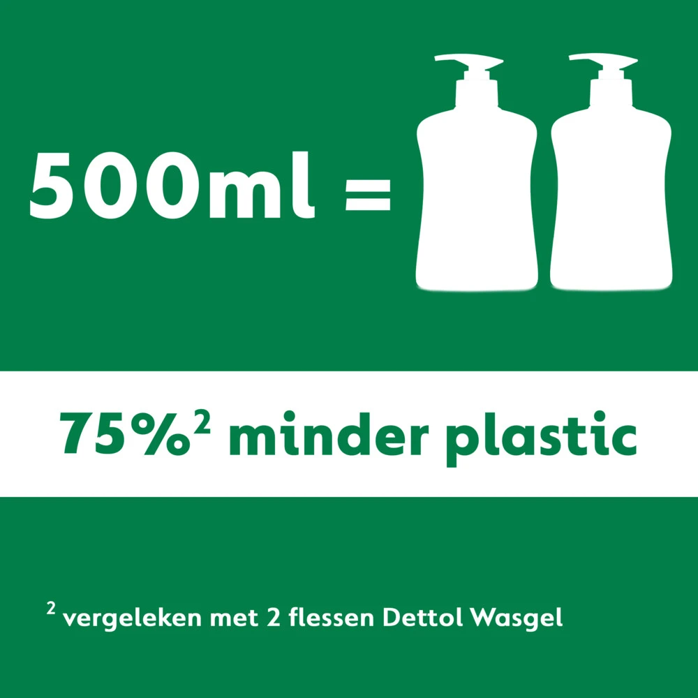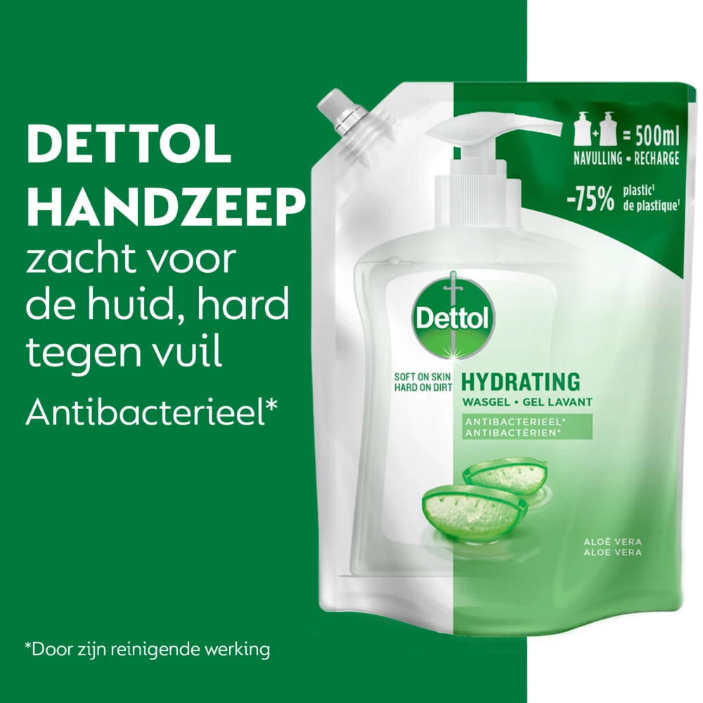 Dettol Refill HandzeepDe dettol wasgel navulling 500ml bevat 75% minder plastic vergeleken met twee 250ml pompjes. Dettol wasgel is speciaal ontwikkeld om de handen grondig te reinigen en tegelijkertijd de huid te verzorgen. De Aloë Vera geur laat een aangename geur achter op de huid en is perfect voor een dagelijks gebruik. HydraterendBevat Aloë VeraHet 500ml navulling formaat kan twee 250ml pompen opladen.