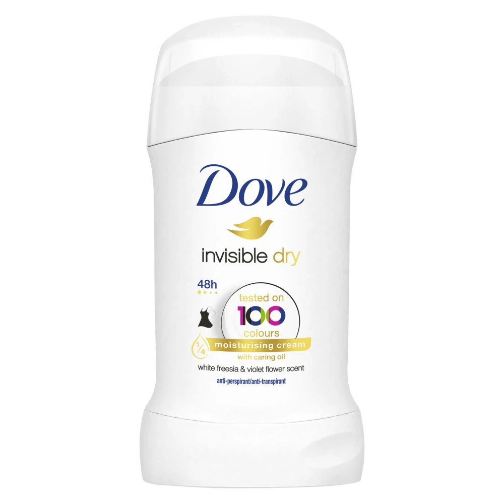 Dove Deodorant Stick Invisible DryMet de Dove Invisible Dry Anti-Transpirant Deodorant Stick zijn witte strepen verleden tijd.Bewezen onzichtbaar op 100 kleuren! Dove Invisible Dry Anti-Transpirant Deodorant Stick beschermt zowel je oksels als je kleding. Deze anti-transpirant is de perfecte oplossing tegen witte strepen en gele vlekken in je kleding. Dove Invisible Dry Anti-Transpirant Deodorant Stick is de eerste deodorant die bewezen onzichtbaar is op zwart, wit en 100 andere kleuren. Het gee