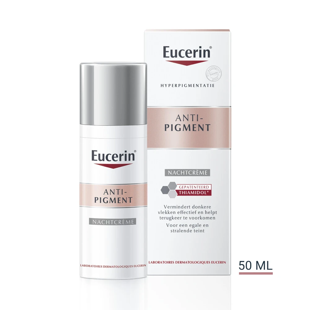 Eucerin Nachtcreme Anti-Pigment Melanine is een natuurlijk pigment dat kleur geeft aan de huid. Blootstelling aan zonlicht, hormonale invloeden en ouderdom kunnen de melanineproductie stimuleren en hyperpigmentatie veroorzaken. Hyperpigmentatie verschijnt als pigmentvlekken en ouderdomsvlekken (ook wel zonnevlekken genoemd) waardoor de huid een ongelijkmatige indruk maakt.Eucerin Anti-Pigment Dagcrème SPF 30 bevat Thiamidol, een doeltreffend en gepatenteerd ingrediënt dat de wor