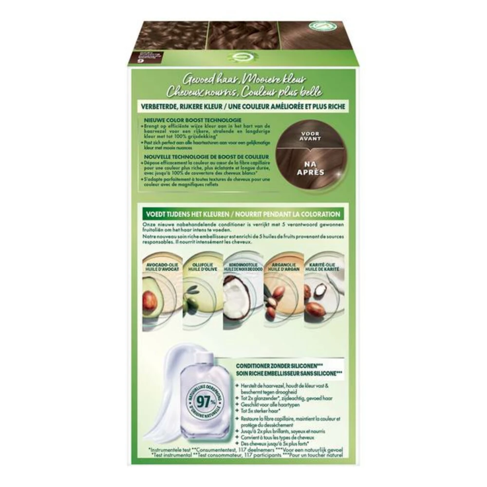 Garnier Nutrisse Crème 60 – Natuurlijk Donkerblond – Haarverf:NIEUWE! formule verrijkt met 4 oliënDeze vernieuwde haarkleuring van Garnier Nutrisse zorgt voor gevoed haar voor een mooiere kleur. Nutrisse voedt het haar diep tot in de wortels, beschermt tegen uitdroging en zorgt voor versterkt haar met een prachtige, glanzende kleur die lang houdt met 100% grijsdekking! De ultra voedende formule is nu verrijkt met 4 oliën: avocado-, olijf-, karité- en cranberry oli&eu
