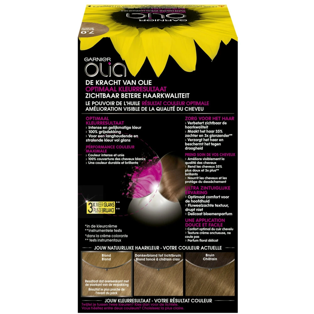 Garnier Olia Haarverf 7.0 – Donkerblond- Intense, levendige en langhoudende kleur- Zichtbaar verbeterde haarkwaliteit, kleur na kleur- 3x Glanzender haar**- 35% zachter haar**- Zonder ammoniak voor een aangename geur- Tot 100% GrijsdekkingErvaar nu de kracht van pure oliën met Garnier Olia!De permanente thuiskleuring met 100% grijsdekking op basis van 60% oliën* geeft het haar een intense kleur, een schitterende glans, en zichtbaar verbeterde haarkwaliteit, kleur na kleu