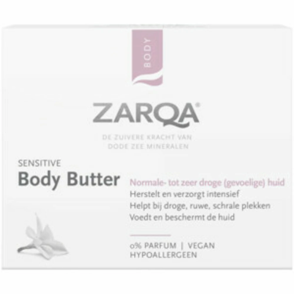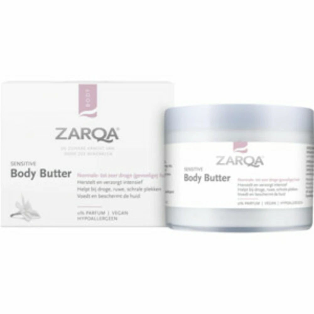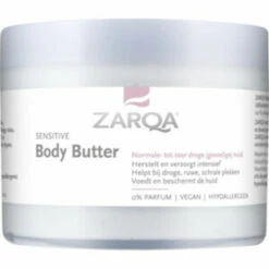 Zarqa Body Butter Sensitive Zarqa Body Butter verzorgt de huid intensief op basis van Dode Zeezout, -mineralen en shea butter. De rijke boter herstelt en kalmeert de (zeer) droge en gevoelige huid en voorkomt en bestrijdt kloofjes, schilfertjes en een ruwe huid. De huid voelt zacht, soepel en goed gehydrateerd aan, de hele dag door.Herstelt en verzorgt intensiefHelpt bij droge, ruwe, schrale plekkenVoedt en beschermt de huid0% ParfumVeganHypoallergeenMet Dode Zee mineralen